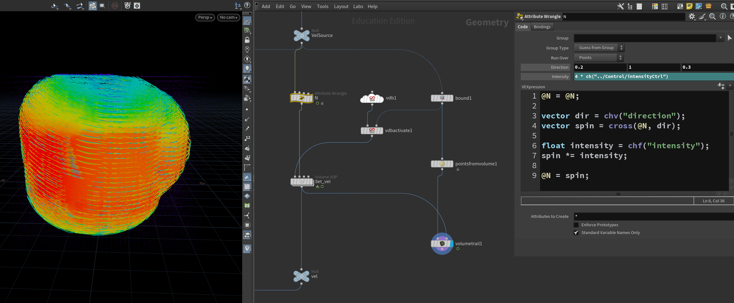 Use VEX code to create a spinning velocity from Normal attribute (@N)