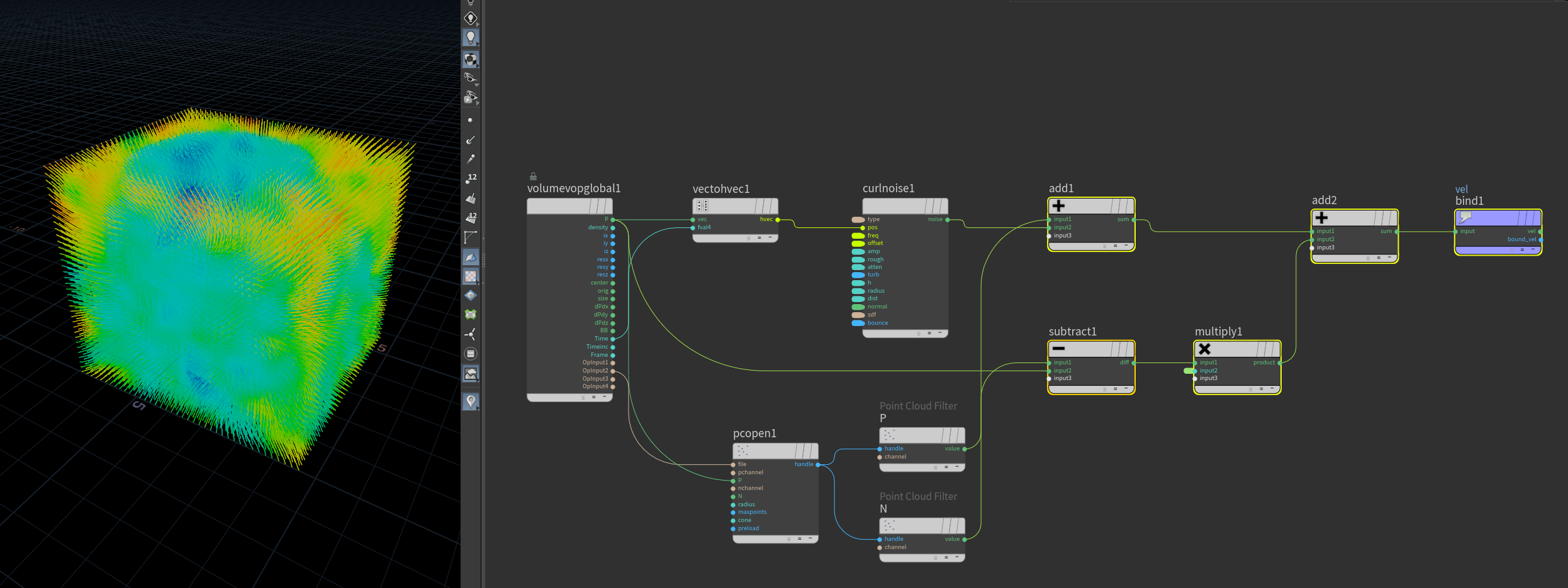 Final velocity field: Combine spinning with noise and push-in vector (to prevent particles from expanding to wide)