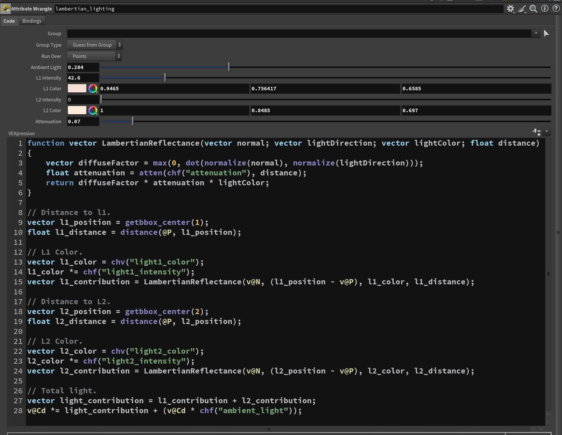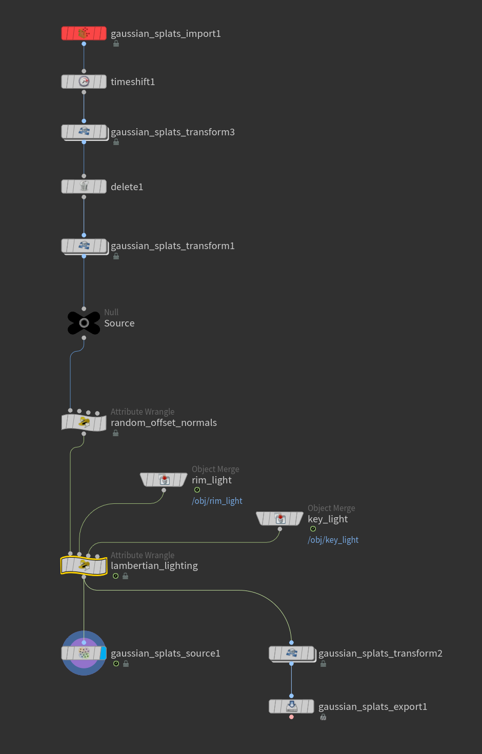 The function: Dot product gives how directly a splat faces the light (0–1), multiplied by distance falloff and light color to give a final RGB contribution. The two lights: Positions driven by getbbox_center() on wrangle inputs — animate a light by moving geometry. Color and intensity are manual channel parameters. The final multiply: v@Cd *= light_contribution + ambient modulates existing color rather than replacing it. Ambient prevents fully black splats.