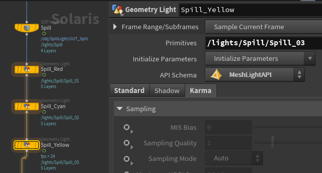 Mesh lights setup in Solaris - in Geometry Light node, add path to the geometry to primitives path and change API Schema to Mesh Light API